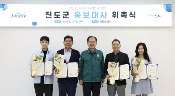 [남도저널 김승귀 기자] 진도군은 지난 19일 재경진도군향우회 김상만 회장과 제9대 박민주 청년회장, 배우 노종현, 송다경 씨를 홍보대사로 위촉했다.