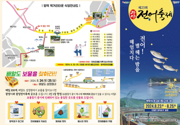 올해로 제23회를 맞은 광양전어축제는 '전어! 별 헤는 밤을 헤엄치다!'라는 주제로 오는 23일부터 25일까지 사흘간 망덕포구 일원에서 개최될 예정이다.