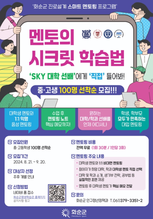 [남도저널 김용범 기자] 화순군은 관내 청소년에게 대학생의 입시 경험과 공부 비법을 상담받을 기회를 제공하기 위해 ‘진로・학습 설계 스마트 멘토링’ 프로그램 참여 학생을 모집한다고 21일 밝혔다.