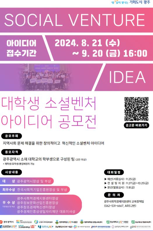 [남도저널 이운현 기자] 광주광역시는 광주사회적경제지원센터와 함께 지역사회 문제해결을 위한 창의적이고 혁신적인 아이디어 발굴을 위해 ‘제2회 대학생 소셜벤처 아이디어 공모전’을 개최한다.