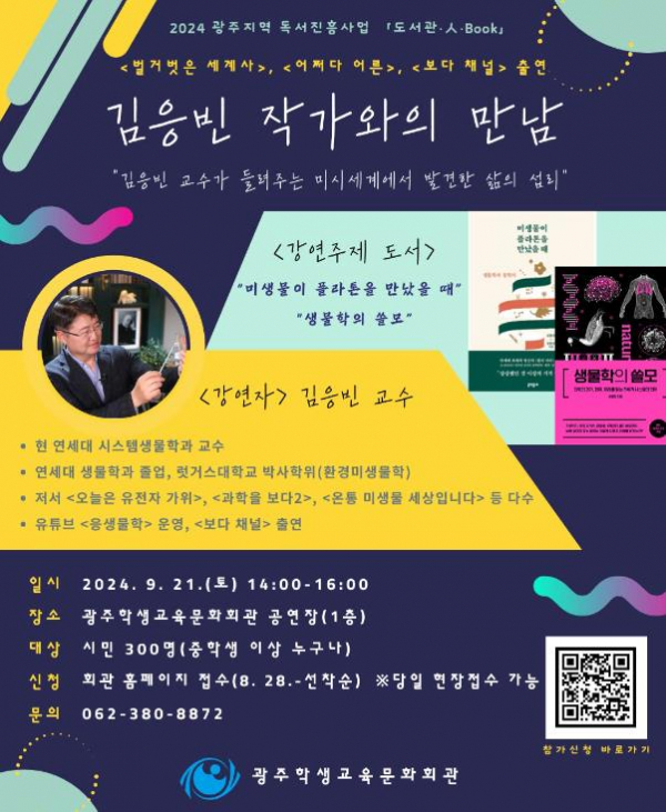 [남도저널 이운현 기자] 광주학생교육문화회관은 오는 9월 21일 회관 공연장에서 ‘김응빈 작가와의 만남’ 행사를 개최한다.