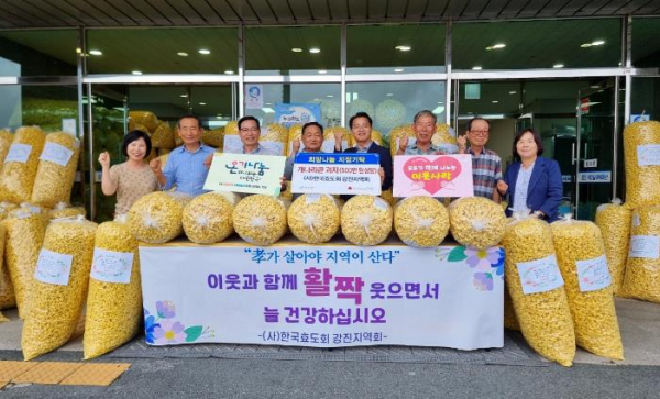 [남도저널 양용숙 기자] 지난 20일, (사)한국효도회 강진지역회가 읍·면 경로당 342개소에 옛날과자(개나리콘과자, 500만원 상당)를 기부했다.