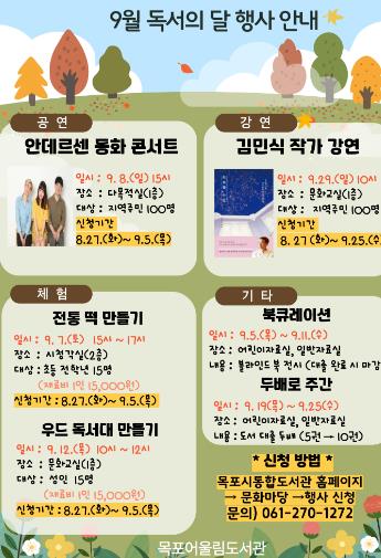 이번 9월 '독서의 달'행사는 ▲안데르센 동화 콘서트 (9월 8일 15시) ▲김민식 작가 초청 강연 (9월 29일 10시) ▲원목 독서대 만들기 ▲추석맞이 전통 떡 만들기 ▲북큐레이션 블라인드 북 전시 ▲도서 대출 권수 두 배로 확대 구성되어 있다.