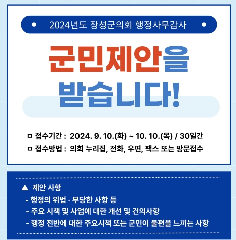 [남도저널 김종훈 기자] 장성군의회는 ‘2024년도 행정사무감사’를 앞두고 9월 10일부터 10월 10일까지 30일간 군민제안을 접수받는다고 밝혔다.