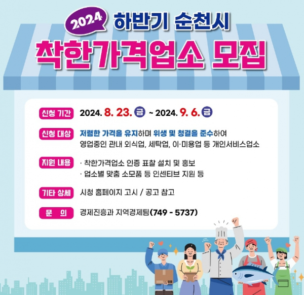 [남도저널 김영도 기자] 순천시는 서민 경제생활 부담을 완화하고 지역 물가안정 및 지역경제 활성화에 기여하는‘착한가격업소’를 9월 6일까지 모집한다고 밝혔다.