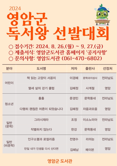 올해의 책과 제출 서류 목록은 영암군도서관 홈페이지 ‘공지사항’을 보거나, 영암도서관로 문의하면 된다.