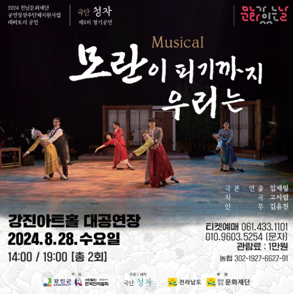 [남도저널 양용숙 기자] 극단 청자가 ‘2024년 전남문화재단 공연장상주단체육성지원사업 레퍼토리 공연’으로 창작 뮤지컬 ‘모란이 피기까지 우리는’을 오는 28일 오후 2시, 7시 두 차례에 걸쳐 20여 명의 전문 뮤지컬배우, 현대무용단, 클래즈 밴드와 함께 강진아트홀 대극장에서 공연한다.