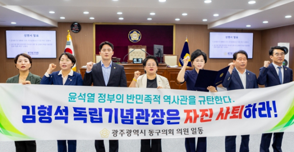[남도저널 김홍열 기자] 광주 동구의회는 27일 본회의장에서 윤석열 정부의 반민족적 역사관을 규탄하고 김형석 독립기념관장의 사퇴를 촉구하는 성명서를 발표했다.