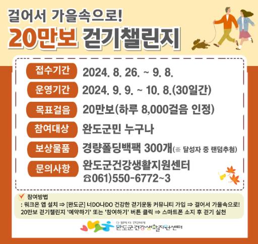 [남도저널 양용숙 기자] 완도군은 걷기 좋은 계절 가을을 맞아 생활 속 걷기를 활성화하고자 ‘걸어서 가을 속으로! 20만 보 걷기 챌린지’를 진행한다.
