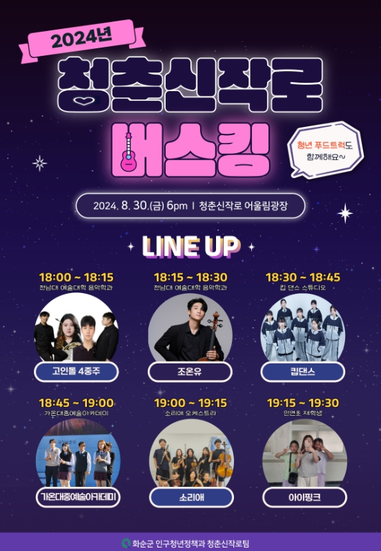 공연 참가 신청은 수시 모집이며, 자세한 내용은 화순군청 인구청년정책과 청춘신작로팀(☏061-379-6722)으로 문의하면 된다.