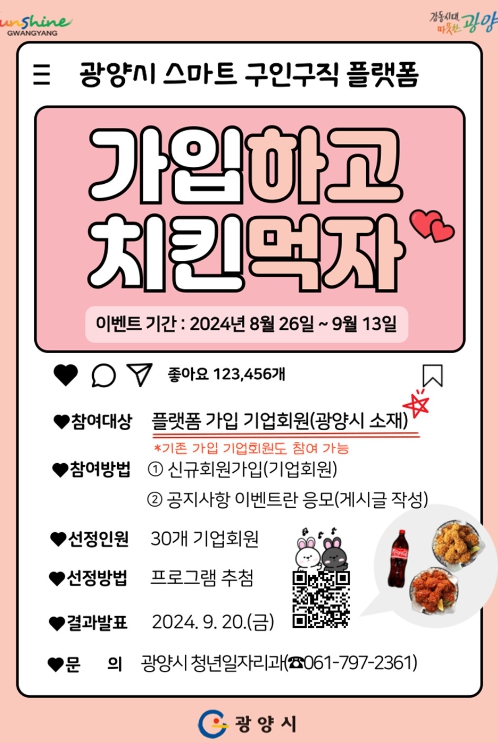 [남도저널 김영도 기자] 광양시는 관내 모든 공공, 민간 일자리 정보를 한눈에 볼 수 있는 일자리 종합 플랫폼인 ‘스마트 구인구직 플랫폼’ 활성화를 위해 기업회원을 대상으로'가입하고 치킨먹자!'이벤트를 진행한다고 밝혔다.