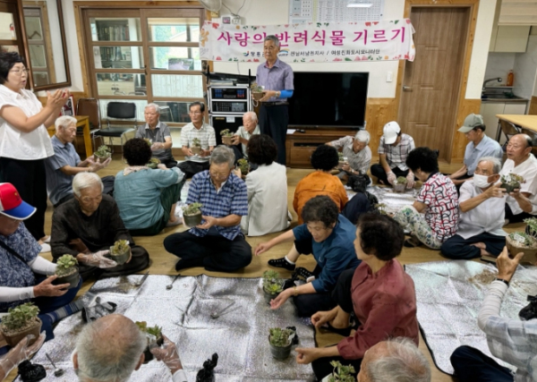 [남도저널 양용숙 기자] 장흥군여성친화도시모니터단(단장 채은아)은 27일 부산면 수성당에서 경로당 어르신 40여명을 모시고 ‘사랑의 반려식물 기르기’행사를 진행했다.