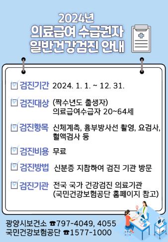 올해 의료급여수급권자 일반건강검진 대상자는 20세부터 64세(1960년생부터 2004년생) 중 짝수년도 출생자로 검진 항목은 △신체 계측 △시력, 청력 측정 △혈압측정 △흉부 방사선 △소변검사 △혈액검사 등이다.