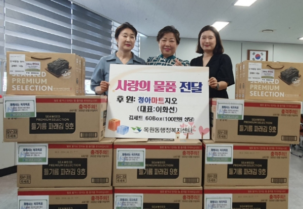 [남도저널 박기철 기자] 추석 명절이 다가오는 가운데 지난 28일 청아마트지오(대표 이화선)가 어려운 이웃에 전달해달라며 목원동 행정복지센터에 김 60세트(100만원 상당)를 기탁했다.