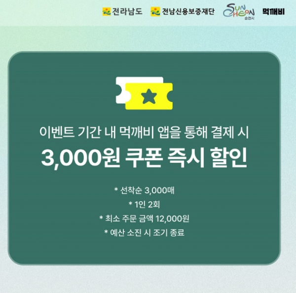 [남도저널 김영도 기자] 순천시는 추석 명절을 맞아 9월 1일부터 공공배달앱 ‘먹깨비’에서 3,000매 가량의 3천원 즉시 할인 이벤트를 진행한다.