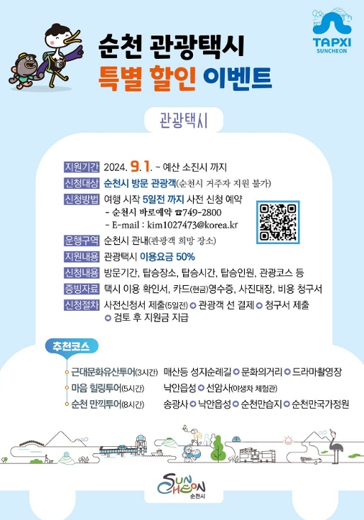 [남도저널 김영도 기자] 순천시는 축제가 있는 가을을 맞아 대중교통을 이용하는 관광객들에게 맞춤형 관광편의를 제공하기 위해 관광택시 요금의 50%를 할인하는 이벤트를 진행한다고 밝혔다.