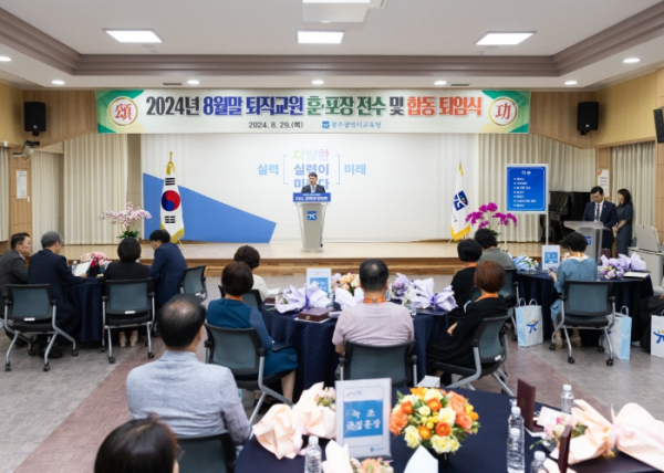[남도저널 이운현 기자] 광주시교육청은 29일 대회의실에서 8월 말 정년퇴직과 2월 명예퇴직 교원 등을 대상으로 ‘퇴직교원 훈·포장 전수 및 합동 퇴임식’을 개최했다.