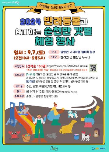 [남도저널 김영도 기자] 순천시 별량면행정복지센터는 2024년 반려동물친화관광도시 조성사업과 연계한 '2024 반려동물과 함께하는 순천만 갯벌 체험행사'를 오는 9월 7일 토요일 오전 10시부터 순천만 청정 갯벌의 아름다움을 느낄 수 있는 별량면 거차마을 뻘배체험장 일원에서 개최한다고 밝혔다.