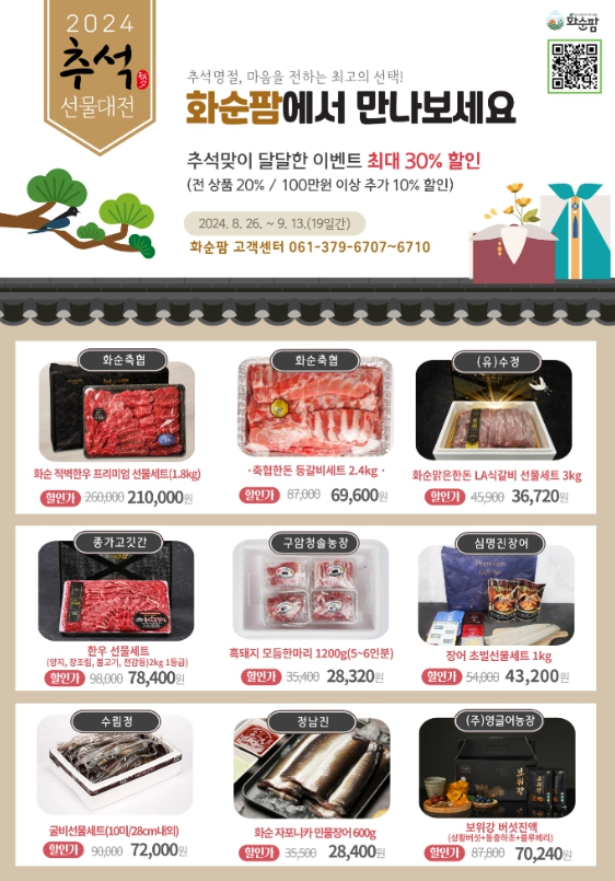 [남도저널 김용범 기자] 화순군은 30일 화순군 농특산물 온라인 쇼핑몰 ‘화순팜’에서 작년에 이어 올 추석에도 다양한 이벤트를 준비했다고 밝혔다.