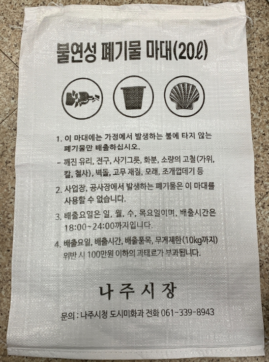 [남도저널 김용범 기자] 전라남도 나주시는 9월부터 깨진 유리나 고철 등의 폐기물이 종량제 봉투에 혼합 배출되어 발생했던 문제를 해결하기 위해, 불연성마대(20L)를 새롭게 도입하고 시범 판매를 시작한다고 30일 밝혔다.