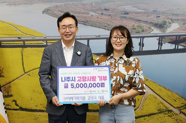[남도저널 김용범 기자] 전라남도 나주시는 ㈜이레가축약품 김영국 대표가 지난해에 이어 올해도 나주시에 고향사랑기부금을 기탁했다고 30일 밝혔다.