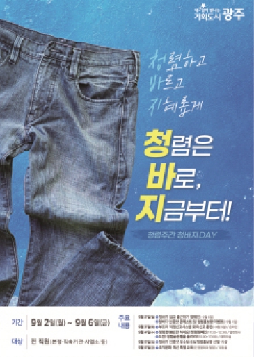 [남도저널 이운현 기자] 광주광역시는 9월 2일부터 6일까지 5일 간을 자체 청렴주간으로 정해 ‘청바지데이’를 운영한다.