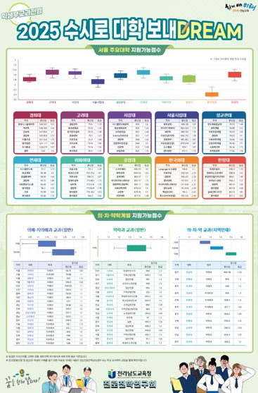 ‘2025 수시로 대학 보내DREAM’은 대학 공개 입시 결과 자료와 축적된 연구회 자료 등의 통계 분석을 통해 서울 주요 대학과 전남대학교, 의치학계열 등 합격 가능 등급과 교과 환산 점수를 예측했다.