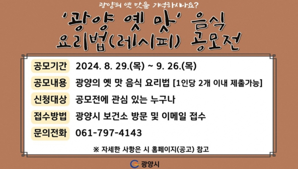 [남도저널 김영도 기자] 광양시는 잊힌 광양의 옛 맛 음식 발굴·복원을 위한 공모전을 개최해 오는 9월 26일까지 신청서를 받는다고 밝혔다.