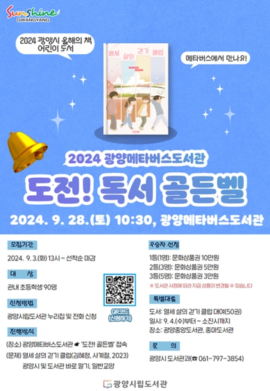 출제 문제는 2024년 광양시 올해의 책 어린이 도서 ‘열세 살의 걷기 클럽’과 광양시·광양시립도서관에 대한 상식 문제가 함께 출제되며, 1~3등 입상자 총 9명에게는 문화상품권을 차등 지급할 예정이다.