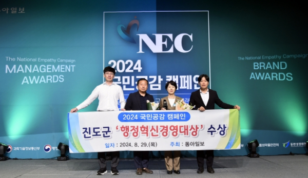 [남도저널 김승귀 기자] 전남 진도군이 지난 29일 서울 더 플라자 호텔에서 열린 ‘2024년 국민공감 캠페인’ 시상식에서 행정혁신경영 부문 대상을 수상했다. ‘국민 공감 캠페인’은 소통을 통해 변화와 혁신을 일으킨 지방자치단체, 기업·기관의 경영 사례와 브랜드를 발굴해 사회에 알리기 위해 마련됐으며, 동아일보가 주최하고 행정안전부·과학기술정보통신부·산업통상자원부 등 10개 기관이 후원한다.