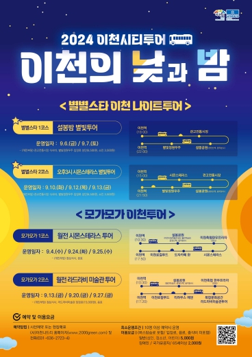 하반기 기획코스는 ‘별별스타 이천나이트투어’, 모가권 관광 활성화를 위한 ‘모가모가 이천투어’, 호법면 ‘코스모스길 투어’ 등 3가지 주제로 구성하고, 주제별 2개의 코스가 각각 운영되어 총 6개 코스, 13회가 운영된다.