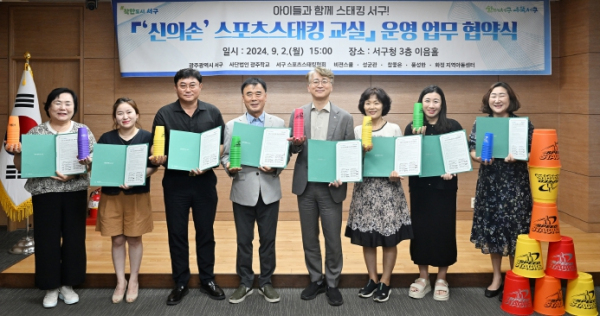 [남도저널 김홍열 기자] 광주광역시 서구가 (사)광주학교, 서구스포츠스태킹협회, 지역아동센터와 2일 서구청 이음홀에서‘신의손’스포츠스태킹교실 운영을 위해 손을 맞잡았다.