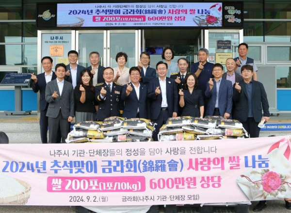 전라남도 나주시는 지난 2일 윤병태 나주시장을 비롯한 금라회 회원 19명이 참석한 가운데 추석 맞이 백미 200포(10kg/600만원 상당) 기탁식을 가졌다고 밝혔다.
