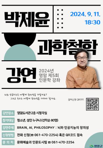 [남도저널 김승귀 기자] 영암군이 이달 11일 영암도서관에 과학철학 전문가 박제윤 박사를 초청, ‘2024년 제5회 인문학 강좌’로 ‘박제윤 과학철학 강연’을 개최한다.