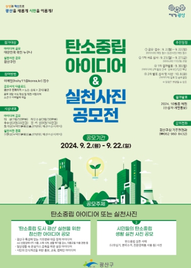 ‘탄소중립 아이디어 공모전’은 탄소중립 도시 광산 실현을 주제로 △기후변화 대응 정책 △일상생활 속 온실가스 감축 △시민인식개선 홍보·교육·캠페인 아이디어 등을 제안받는다.