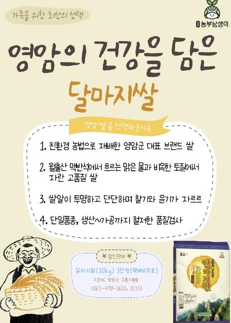 이밖에 달마지쌀 판매와 쌀케팅에 대한 자세한 안내는 영암군 유통기획팀(061-470-2603, 2613)에서 한다.