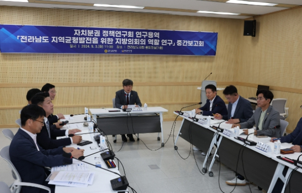 [남도저널 박기철 기자] 전라남도의회 의원 연구단체인 ‘자치분권 정책연구회(대표의원 박원종)’가 지난 9월 3일 전라남도의회 중회의실에서 ‘전라남도 지역균형발전을 위한 지방의회의 역할’ 연구용역 중간보고회를 개최했다.