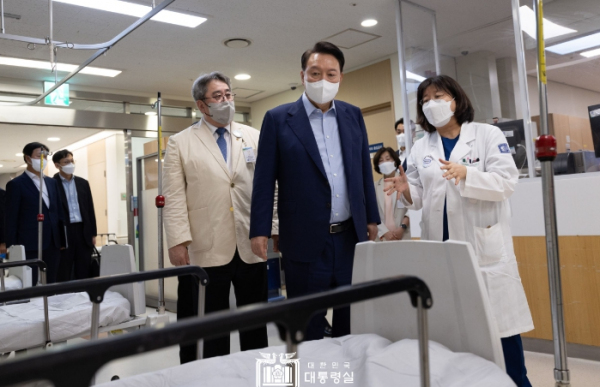 [남도저널 김용범 기자] 윤석열 대통령은 9월 4일 저녁 8시 50분 쯤 의정부 성모병원 권역응급의료센터를 방문해 1시간 20분 가량 머물며 국민 건강을 위해 헌신하고 있는 의료진을 격려하고 현장의 의견을 청취했다.
