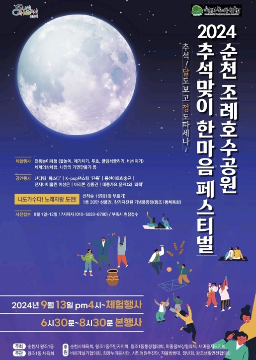 [남도저널 김영도 기자] 순천시 왕조1동은 추석 명절을 맞이하여 이웃과 정을 나누며 함께 즐길 수 있는 한마음 페스티벌을 오는 13일 조례호수공원에서 개최한다.