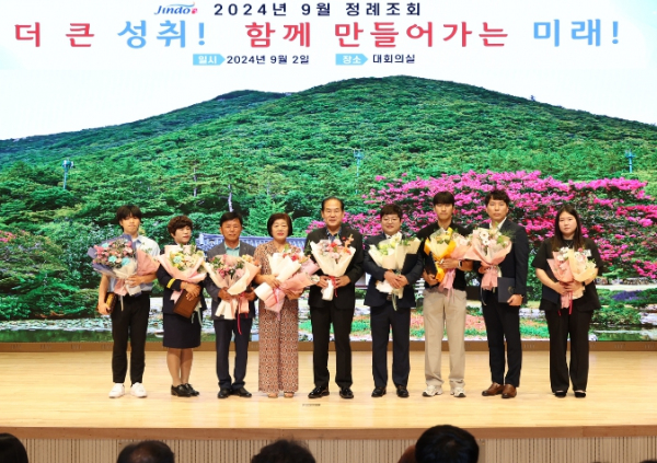 [남도저널 김승귀 기자] 진도군은 지난 9월 2일 300명의 공직자가 참석한 가운데, 9월 정례조회를 개최했다. 김희수 군수는 결실의 계절 가을을 맞이해 직원들의 그간의 성과와 노고를 격려함과 동시에 ‘땀 흘리지 않고는 아무것도 이룰 수 없다’는 무한불성(無汗不成) 정신을 강조하며 직원들이 더욱 업무에 매진할 것을 당부했다.