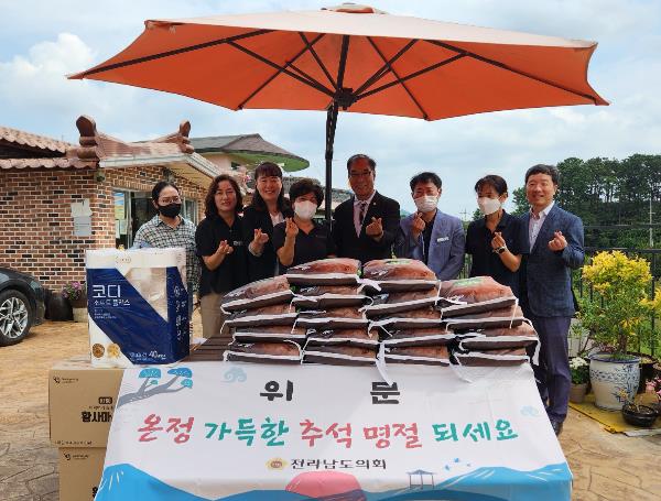[남도저널 박기철 기자] 전남도의회 김회식 의원(더불어민주당, 장성2)은 지난 9월 3일 민족 고유 명절인 추석을 맞아 장성군 진원면에 위치한 ‘가나실버홈’을 방문하여 위문품을 전달했다.