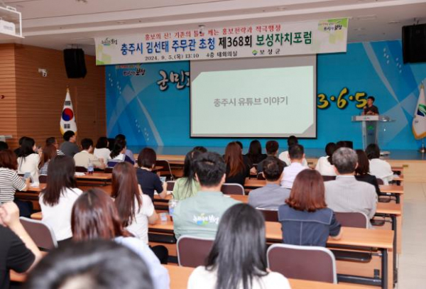 [남도저널 서인호 기자] 보성군은 지난 5일‘충주시 홍보맨’으로 유명한 김선태 주무관을 초청해 ‘틀을 깨는 홍보전략 및 적극행정’이라는 주제로 제368회 보성자치포럼을 개최했다고 밝혔다.