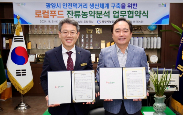 [남도저널 김영도 기자] 광양시는 지난 9월 5일 동광양농협 조합장실에서 광양시농업기술센터와 동광양농협이 ‘로컬푸드 잔류농약분석 업무협약’을 체결했다고 알렸다.