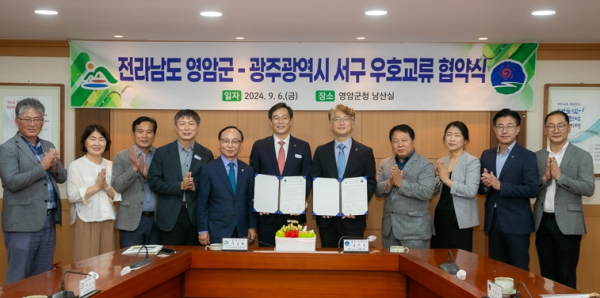 [남도저널 김승귀 기자] ‘더 큰 영암’을 표방하는 전남 영암군이, 6일 군청에서 ‘우뚝 서구’의 광주광역시 서구와 문화·관광·예술·체육·경제·교육·행정 전반의 상호교류와 상생발전을 도모하는 우호교류 협약을 체결했다.