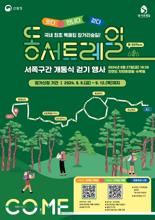 [남도저널 김용범 기자] 산림청은 오는 9월 27일 충청남도 태안군에서 개최되는 ‘동서트레일 서쪽구간 숲길 걷기행사’ 참가자를 모집한다고 6일 밝혔다.