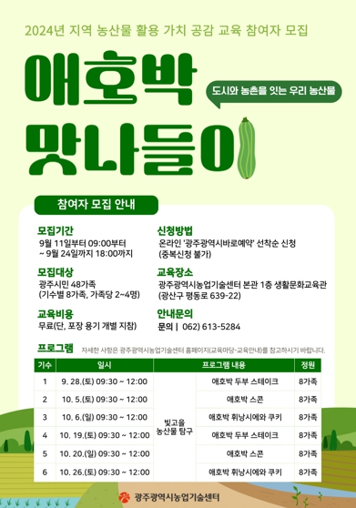 [남도저널 이운현 기자] 광주광역시농업기술센터는 지역 대표 농산물인 애호박의 소비 촉진과 색다른 조리법 보급을 위해 ‘지역농산물 활용가치 공감 교육’ 참가자를 11일부터 모집한다.