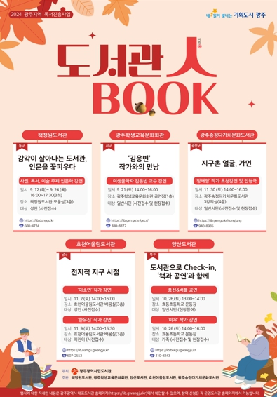 ‘도서관·人·book’ 행사에 대한 내용은 광주광역시대표도서관 누리집에서 확인할 수 있으며 참가 접수는 각 운영도서관 누리집에서 개별 신청 가능하다. 자세한 사항은 광주시립도서관 관리과로 문의하면 된다.