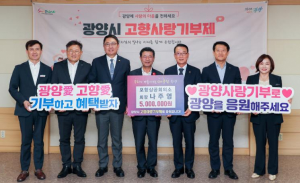 지난 8월 28일에 우광일 광양상공회의소 회장이 형제 도시 포항시를 방문해 고향사랑 기부금 500만 원을 전달한 것에 이어, 나주영 회장도 통 큰 기부를 이어가며 상생발전에 앞장섰다.
