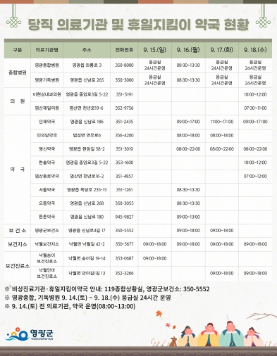 연휴 기간 동안 갑작스러운 건강이상이나 응급 상황으로 인해 의료기관을 방문해야 하는 군민들이 안전하고 신속한 진료를 받을 수 있도록 응급의료기관 2개소에서 9. 16, 08:30 ~ 13:30 오전 정상진료를 실시한다고 밝혔다.