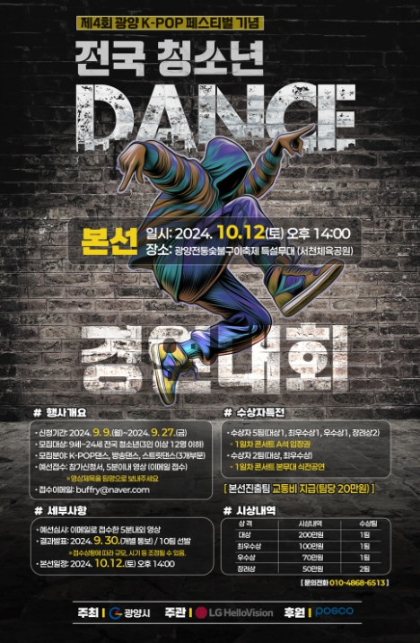 ‘전국청소년 댄스경연대회’는 광양시가 주최하고 LG헬로비전이 주관하며 포스코가 후원하는 행사로 대한민국의 미래를 선도할 청소년들의 꿈과 열정을 발산할 무대를 제공하기 위해 기획됐다.
